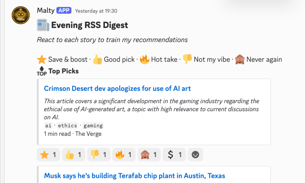 Every evening, Malty would drop a personalised news digest into Discord. Not a raw firehose of everything I subscribe to, a curated shortlist: Top Picks, Worth Reading, Long Reads. Articles scored and filtered based on what I actually care about, with duplicates removed. React with an emoji and it learns. The more you use it, the sharper it gets.